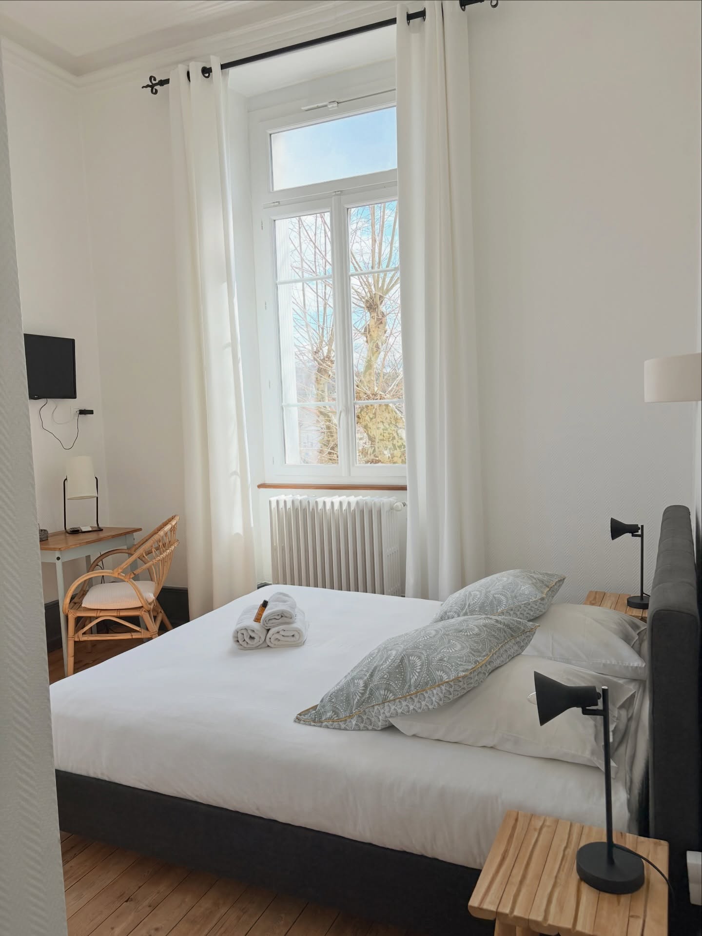 Elle dispose : d’un lit double 160 cm, d’un lit superposé et d’un lit simple 90 cm. Décorée dans des tons bois et crème, cette chambre offre une ambiance chaleureuse et apaisante. Ses deux grandes fenêtres et son plafond haut apportent une belle luminosité naturelle.